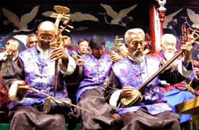 A photo taken on Nov. 23rd, 2002 shows a group of elderly musicians in traditional costumes playing Naxi ancient music with unique ancient Naxi musical instruments in Southwest China's Yunnan province.