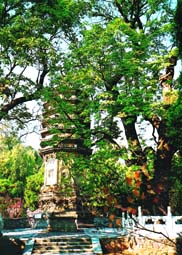 The Twin Sal Trees in front of the nine-story Monk Tongli Pagoda in the Tanzhe Temple, Mentougou District. They are the oldest sal trees in China and are known as holy trees.