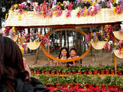 Two visitors take a picture during the Huqiu Floral Exhibition held in Suzhou, a city of east China's Jiangsu Province, March 8, 2003. Some 260,000 pots of about 200 varieties of flowers are on display in the three-month exhibition which opened on Saturday.