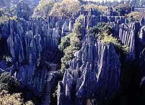 The stones in the tourist area bear names like the Stone Mushroom, the Orangutan, and Two Birds Feeding Each Other, and with a little bit of imagination, some of them bear striking resemblance to their namesakes. The area is populated by the Sani branch of the Yi minority, and the most famous stone formations in the forest are named Ashima and A'hei. According to the Sani legend, Ashima was a beautiful girl in love with A'hei. The two passed their days happily, meeting in the stone forest for some heavy courting, until one day Ashima's beauty caught the attention of a powerful landlord's son. The landlord arranged it with Ashima's parents that she would become his son's wife. Ashima and A'hei were heartbroken, and made a plan to run away together. One night, Ashima stole away from the landlord's grounds and ran to meet A'hei in the stone forest. Their plan failed, though, and the landlord's son killed Ashima. The gods were so moved by the tragedy that they made by a pond two stone columns in the lovers' likeness, so that Ashima and A'hei could be together in the stone forest for all time.