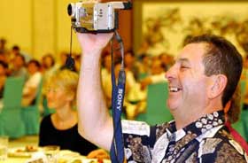 A tourist from Australia shoots with a digital video during a state banquet in the Great Hall of the People in Beijing July 4, 2003. The first group of 549 tourists from Hong Kong and 7 countries, organized by China International Tour Service (CITS), enjoyed a free state banquet in Beijing after the World Health Organization removed the city from the list of SARS-affected areas and lifted its travel advisory against it.
