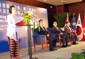 Chong Yoke Har, an official from the Tourism Bureau of Malaysia, gives a speech at a symposium in Beijing on the revival of tourism in Asia on July 9, 2003.