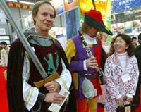 A visitor chats with representatives from Kassel in Germany wearing traditional costumes at the 2004 Shanghai World Tourism Resources Expo, which opened February 19, 2004 in Shanghai.