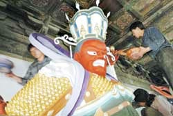 In order to recover the original look of the sculptures the temple has invited experienced artisans from northwest China's Shanxi Province to refurbish the ancient works of art using traditional Chinese methods.