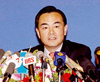 At a press conference held Aug. 29, 2003 following the six-party talks, Chinese Vice Foreign Minister Wang Yi says the six parties have reached six-point consensus on the Korean nuclear issue.