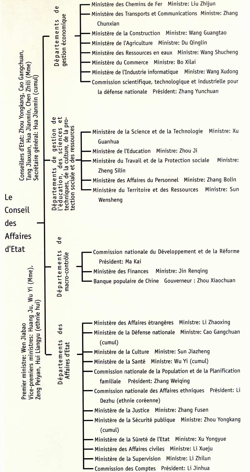 Le Conseil des Affaires d'Etat est composé du premier ministre, des vice-premiers ministres, des conseillers d'Etat, des ministres, des présidents des commissions, du président de la Commission des Comptes, du gouverneur de la Banque populaire et du secrétaire général. Les départements et le personnel qui constituent l'actuel Conseil des Affaires d'Etat sont présentés par le tableau ci-dessous: