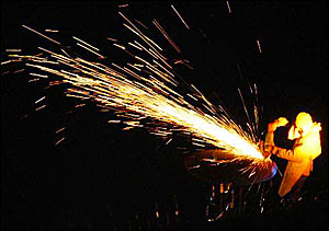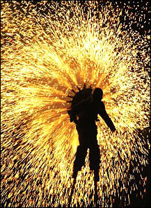 Une personne marchant sur des échasses porte sur le dos des feux d'artifices. C'est la première représentation de cette oeuvre originale en Asie.