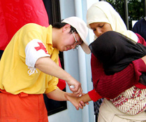 Un médecin de l'équipe de secours chinoise bande la plaie d'une sinistrée des tsunamis en Indonésie