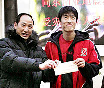 Liu Xiang (à droite), champion olympique du 110 mètres haies aux Jeux d'Athènes et son entra?neur Sun Haiping font un don aux victimes des tsunamis de l'océan Indien le 4 janvier à Beijing.