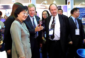 Lin Wenyi (à gauche) visitant la zone d'exposition des entreprises australiennes, en la compagnie de M. Sandy Hollway (au milieu). Président du Comité d'Organisation des Jeux Olympiques de Sydney. les entreprises participantes furent fournisseurs d'équipements, techniques, matières et services pour les Jeux de Sydney.
