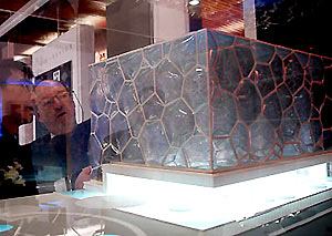 La piscine ? Cube d'Eau? et son modèle devant le siège d'exposition de la Société consultative de conception de la Compagnie de construction de Chine (Shenzhen), une des sociétés de conception du Centre Olympique des Sports Nautiques de Tianjin.