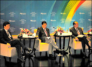 Long Yongtu, secrétaire générale du FAB, Fidel Ramos, ex-président des Philippines et Bert Hofman, économiste en chef de l'Agence de la Banque mondial à Beijing.