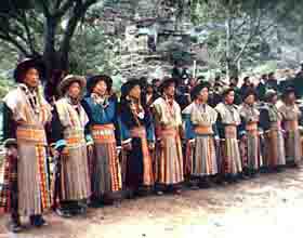 Danse d'armure. Cette danse rituelle exécutée à l'occasion de funérailles présente la solennité et la virilité. Un certain nombre de jeunes hommes jouent des guerriers antiques en portant une armure en cuire de b?uf et un casque à plumes de faisan et à brins de queue de yack. Ils font lentement le tour de l'endroit, tenant haut un couteau, imitant le tir de fusil et poussant de temps à autres des cris ? ao-ya !, ao-wu !?. En créant une ambiance sévère, on vise à exorciser les démons et protéger le défunt. Après plus tours de l'endroit, les guerriers changent plusieurs fois la formation du défilé et se combattent, pour représenter le courage des guerriers antiques.