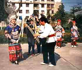 Tra?ner le mouton. De jeunes hommes jouent de la Lusheng en dansant. Les filles qui les suivent. Si l'une d'entre elle trouve un gar?on qui lui pla?t, elle attache un joli ruban qu'elle a tissé autour de ses reins, puis le suit en tirant un bout du ruban et en piétinant avec le rythme. Un bon joueur de Lusheng peut être suivi en même temps de plusieurs jeunes filles. Dans ce cas, le gar?on ne peut, bien s?r, désigner tout de suite sa bien aimée.
