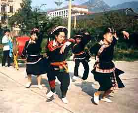 Danse rituelle. Normalement, elle est exécutée avec l'accompagnement de tambours et de gongs. La plupart des danseurs sont des personnes d'age moyen et agées. On utilise des Lusheng longue d'entre un et trois mètres.