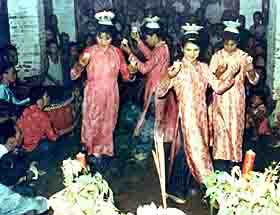 Les jours suivants, on pratique la danse de bougie. Des filles dansent autour des autels, supportent sur la tête et les paumes de petites assiettes portant des bougies, tournent et meuvent les bras. Ainsi les mèches enflammées tracent des rayons autour des danseuses. C'est un spectacle agréable à vue.