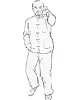 D?placer le corps vers l?arri?re, le centre de gravit? d?plac? progressivement vers la jambe gauche. Retirer un peu le pied gauche et le poser fermement sur le sol, retirer ?galement le pied droit et poser la pointe du pied sur le sol. En m?me temps, lever la main gauche et l?avancer comme pour saisir quelque chose, lorsqu?elle arrive ? la hauteur de la bouche, rassembler les cinq doigts, le poignet naturellement fl?chi. Placer en m?me temps la main droite ? c?t? du flanc.