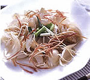 ans de l'eau bouillante, les repêcher, les égoutter et les mettre dans un récipient. Ajouter les filaments de jambon et de poulet, du sel, du poivre et de l'essence de poulet, mélanger le tout.