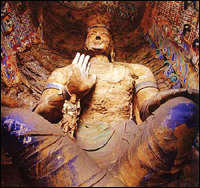 In der fünften H?hle befindet sich eine 17 m hohe und 15,3 m breite sitzende Buddha-Statue: Ihre Fü?e sind 4,6 m lang und ihre Mittelfinger l?nger als der gr??te Korbballspieler – 2,3 m. Eine weitere 13 m hohe Buddha-Statue, die im Freien steht, ist so imposant, da? viele chinesische und ausl?ndische Touristen sie fotographieren. Die gro?en Augen, die hohe Nase, die dünnen Lippen, das volle Gesicht sowie die breiten und kr?ftigen Schultern charakterisieren diese Buddha-Statue als ein hervorragendes Werk der Bildhauer des chinesischen Altertums. überdies ist erw?hnenswert, dass etwa tausend blo? zwei cm hohe Buddha-Figürchen in die Kutte einer gro?en Buddha-Statue eingelassen sind. Diese winzigen Statuetten, deren Gesichter von Verwitterung schon ziemlich angegriffen sind, sind alle unterschiedlich gestaltet.