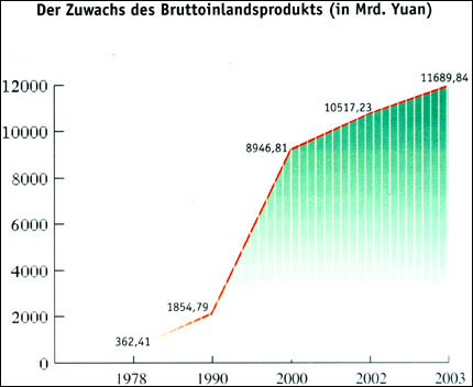 Vor der Gründung der Volksrepublik im Jahr 1949 war China wirtschaftlich sehr rückst?ndig. Heute z?hlt China zu den wirtschaftlich starken L?ndern mit dem gr??ten Entwicklungspotenzial. Das Leben des Volkes erreichte im Gro?en und Ganzen einen bescheidenen Wohlstand. Besonders in den 22 Jahren seit der Einführung der Reform- und ?ffnungspolitik im Jahr 1979 ist die chinesische Wirtschaft in einem nie da gewesenen Tempo gewachsen. Seit dem Eintritt ins 21. Jahrhundert entwickelt sich die Wirtschaft in China weiter mit einer st?ndig hohen Geschwindigkeit. Im Jahr 2003 erreichte das Bruttoinlandsprodukt mit einer Wachstumsrate von 9,1% 11689,84 Milliarden Yuan.
