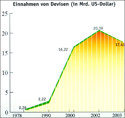 Im Jahr 2003 gab es allerdings einen Einbruch in der seit Jahren positiven Entwicklung. Die Ursache war die Seuche SARS in der ersten Jahresh?lfte. Ab 1. Mai führten das Finanzministerium, das Staatliche Steueramt und die anderen betreffenden Abteilungen eine Reihe von Ma?nahmen zur Unterstützung der mit dem Tourismus im Zusammenhang stehenden Branchen wie Steuererm??igung oder -befreiung sowie Gew?hrung von Diskontkrediten durch. Nach Ende der Seuche stiegen die Inlandsreisen von Chinesen im dritten Quartal wieder rapide an, und auch die Reisen von Ausl?ndern begannen sich wieder zu beleben.