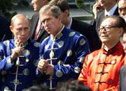 Staatspr?sident Jiang Zemin, der US-amerikanische Pr?sident George W. Bush und der russische Pr?sident Wladimir Putin beim Gespr?ch w?hrend des 9. inoffiziellen APEC-Gipfels