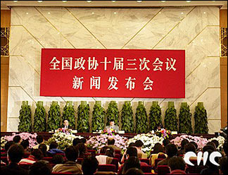 Heute Nachmittag um 15.00 Uhr fand die erste Pressekonferenz der 3. Tagung des 10. Landeskomitees der Politischen Konsultativkonferenz des Chinesischen Volkes (PKKCV) in der Gro?en Halle des Volkes statt. Der Sprecher Wu Jianmin informierte in- und ausl?ndische Journalisten über die Tagesordnung der bevorstehenden Tagung.