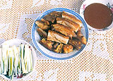 1. Das Schulterst?ck fast gar kochen, waschen und in 1,3 cm dicke Scheiben schneiden. Mit der Schwarte nach unten in einer Sch?ssel m?glichst in der urspr?nglichen Form sch?n anrichten. 50 g Sojaso?e, den Ingwer, einen Teil des Porrees und 35 g Reiswein hinzugeben und im Bambusd?mpfkorb 1 Stunde d?mpfen lassen. Durch ein Sieb abgie?en und die Suppe griffbereit stellen.