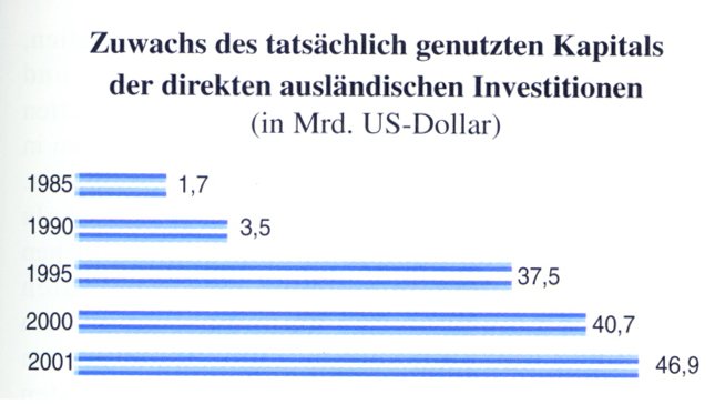 Zusammenbau sowie Emission von Aktien im Ausland.Zwischen 1979 und 2001 summierte sich das in China tatsächlich genutzte Auslandskapital aus den direkten ausländischen Investitionen auf 393,5 Milliarden US-Dollar. China ist nach den USA das zweitgrößte Land hinsichtlich der Aufnahme ausländischen Kapitals