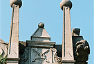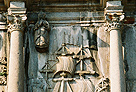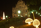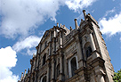 大三巴は花崗巖で築造されたもので、もとのサント?パクロ教會堂の正面の壁の遺跡であり、壁全體はバロック風のものであるが、一部の設計と彫刻ははっきりした東方の色彩を持つもので、例えば、中國語の文字と日本の伝統(tǒng)を象徴する菊の花の丸い図案などがそれである。この中國と西洋の建築物の風格を結び付けた門のある壁は全世界のカトリック教會堂の中でまたとない存在である。 |