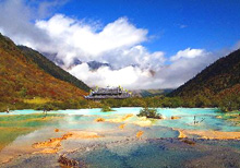 獨特の自然景観で國內(nèi)外に知られる名所?黃龍風(fēng)景區(qū)は、四川省北部の阿ハ藏族羌族自治州?松潘県內(nèi)に位置する。地表が薄い黃色の厚いカルシウム化合物の層に覆われ、樹海の中でうねる黃金の巨龍を思わせることから、命名された。黃龍は1992年、國連教育科學(xué)文化機関(ユネスコ)により世界遺産に登録された。