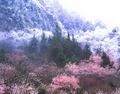 秋風(fēng)が吹くころになると、谷間の両側(cè)の密林に並ぶカエデやモミジ、シラカバ、フジマツなどの葉が霜に濡れるたびに美しく鮮やかな紅色、黃金色に変わっていく。山々は紅葉に彩られ、流水も紅葉に染まり、道も紅葉に覆われ、ミヤロの秋は一気に火炎に包まれる。雪を頂いた山々、溫泉、森林、紅葉、そしてチベット?チャン族の文化が織りなす新奇で、夢(mèng)幻な回廊がどこまでも広がる。
