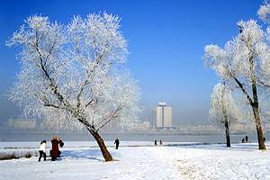 冷な空気にさらされて樹木に凝結し、不可思議で純潔な、非常に美しい氷の花、樹氷が徐々に形成されていく。早朝。朝陽によって霧のベールが解かれると、5キロ余り続く土手のマツやヤナギはすっかり銀裝束に。川岸の散策は、あたかも桃源郷にいるかのようだ。