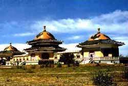 12世紀(jì)頃のモンゴル族の首領(lǐng)?ジンギスカン(1162-1227年)の陵墓である。伊金霍洛旗に位置する。包頭から南へ東勝を経由して120km。主體建築は3つのモンゴル族の住居、パオの形をした大殿からなっており、中央は記念堂になっている。記念堂の裏にジンギスカン夫婦の柩が安置されている。陵墓全體は壯大で、線香の煙がゆらぎ、國(guó)內(nèi)外からの參拝客は多い。毎年4回の正式祭祀活動(dòng)があり、盛大でにぎやかである。