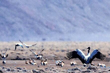 寫真(上):國(guó)家一級(jí)重點(diǎn)保護(hù)動(dòng)物に指定されているオグロヅル。(西蔵自治區(qū)阿里地區(qū)の川原で撮影)