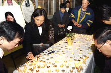 寫真右:キャンドルの炎でチャンさんに哀悼の意を捧げる?yún)⒘姓?