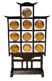 大きさが同じで厚さの異なった多數(shù)の小さなどらでワンセットの雲(yún)鑼を構(gòu)成し、音の高さが決まっている。音の高い低いによって、木棚の上にかけてならべ、下には柄があり、どのどらも三本の縄で締め付けられ、木枠の間に吊り下がるようになっている。新中國の建國以前、雲(yún)鑼はよく「行楽」と「坐楽」に用いられた。「行楽」とは、演奏者が左手で木棚の柄を握り、右手でツチを持ち、歩きながらどらを打つのである?!感袠S」の際は、柄を握り易くするため、どらの數(shù)を限定し、普通は十個に限られる?!缸鴺S」の際は、銅鑼の數(shù)を増やすことができる。例えば西安鼓楽の雙雲(yún)鑼は、二組の雲(yún)鑼を一組にしたもので、木棚には柄がなく、二つの木棚が相連なり、演奏の際、どらの木棚を直立させ、二枚の屏風(fēng)のように見え、二組の雲(yún)鑼を同時にたたく。