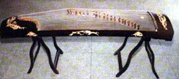 箏の共鳴箱は木製、長方形で、弦が胴板の上に張られ、これまで各地でよく使われていた箏は、絲弦あるいは銅絲弦を張り、弦の數(shù)は12、13、15あるいは16本で、弦の長さと音の高さは柱といわれる小さな柱を使って調節(jié)するようになっている。普通は「ミ、ファ、ラ、シ、ド」の5音で構成される。改造後の箏は、鋼絲弦を張り始め(楽曲の必要から絲弦を張っているものもまだある)、弦の數(shù)を増やし、19、21、25、26本を張るものも現(xiàn)われ、そして手や足でコントロールする調子調節(jié)の裝置がつけられているものもある。改造後の箏は、音域がさらに広くなり、音量が大きくなり、調子も調節(jié)しやすく、表現(xiàn)力も豊かになっている。箏は獨奏、伴奏および器楽合奏に用いられる。