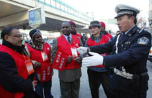 寫真(左):上海の街角で道路狀況に関する警察の説明に耳を傾ける外國(guó)人留學(xué)生