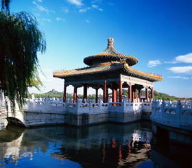 北海公園は、庭園の歴史のなかで蕓術的な傑作だと言える。面積は69ヘクタール(うち水面が39ヘクタール)。瓊華島は樹木に覆われ、宮殿や仏閣が並び、亭や樓閣が交錯して趣がある。中央に聳える白塔はまさに、北海公園のシンボル的存在。湖岸をめぐる垂れ下がった柳が湖に映して美しい。