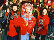 北京でこのほど、民俗學(xué)者がプロデュースに參加し、自ら司會(huì)を擔(dān)當(dāng)した伝統(tǒng)的な結(jié)婚式が開(kāi)かれた。使われた道具類や衣裝、式次第などはすべて中國(guó)の伝統(tǒng)的なしきたりに従ったものだ。新郎の崔萬(wàn)濤さん、新婦の李娟さんは、參列者とともににぎやかな祝福のムードにひたった。