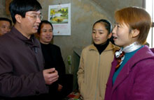 寫真:拉致された陳親愛さんの実家を訪れ、陳さんの妻(右端)と娘を見舞う現(xiàn)地政府幹部。中央政府の被害者家族への関心を伝えた。