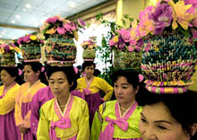 寫真(右):北京市民による公演。衣裝には、伝統(tǒng)蕓能?京劇の「くま取り」がデザインされている。
