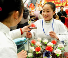 14日のバレンタインデーを控え、各商店はプレゼント商戦に工夫を凝らしている。蘇州市のある商店にこのほど、バラをかたどった色鮮やかなチョコレート彫刻99點が登場し、買い物客の注目を集めた。
