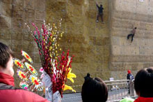 寫真(右):スリルを求める若者の人気を集めたロッククライミング(北京郊外?竜潭廟會)