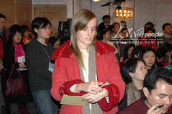 寫真(左):第10期全國政協(xié)第3回會議の記者會見で質問する香港の衛(wèi)星テレビ?鳳凰衛(wèi)視(フェニックステレビ)の閭丘露薇記者(=2日午後撮影)。閭丘記者は03年のイラク戦爭でバグダッドへ取材に行き、「戦場のバラ」と呼ばれた。