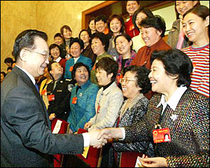 溫家寶國務(wù)院総理は3月7日、全人代の江蘇省代表団グループの討論に參加し、代表たちとともに政府の活動報告を?qū)徸hした。3月8日の「國際婦人デー」を控えていることもあり、會議の後、溫家寶総理は同代表団のすべての女性代表たちと記念寫真を撮り、お祝いの意を表した。