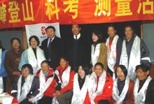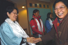 寫真(右):中日女子登山隊の日本側(cè)隊長?橋本しをりさん(寫真左側(cè))に哈達(カタ:敬意を表す白い絹の?。─蛸洡氪稳首骏?西蔵自治區(qū)政治協(xié)商會議副主席(同右側(cè))