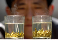 寫真(左):西湖竜井茶の産地?杭州市梅家塢村で、摘み取ったばかりの茶葉を煎る朱長水さん=24日撮影