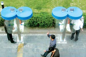北京市の通信會社?北京網(wǎng)通の公衆(zhòng)電話管理部門が19日明らかにしたところによると、同社は北京市內(nèi)の通信ケーブル未開通地域に、中國版PHS「小霊通」の通信網(wǎng)を利用した公衆(zhòng)電話ボックス200臺を設(shè)置した。この電話ボックスの特徴は、ボックス上部に設(shè)置されたソーラーパネルでバッテリーを充電できることだ。